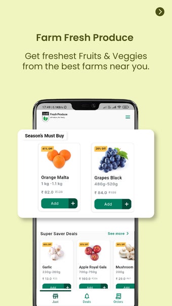 JUST Fresh-Buy Fruit Vegetable är en gratis app för Android som erbjuder en smidig plattform för att köpa färska frukter och grönsaker direkt från lokala gårdar. Med över 100 olika sorter tillgängliga, kan användare enkelt beställa allt från exotiska frukter till köksfavoriter. Appen garanterar hög kvalitet genom rigorösa kvalitetskontroller och en trestegs rengöringsprocess för att säkerställa att produkterna är säkra och fräscha vid leverans.